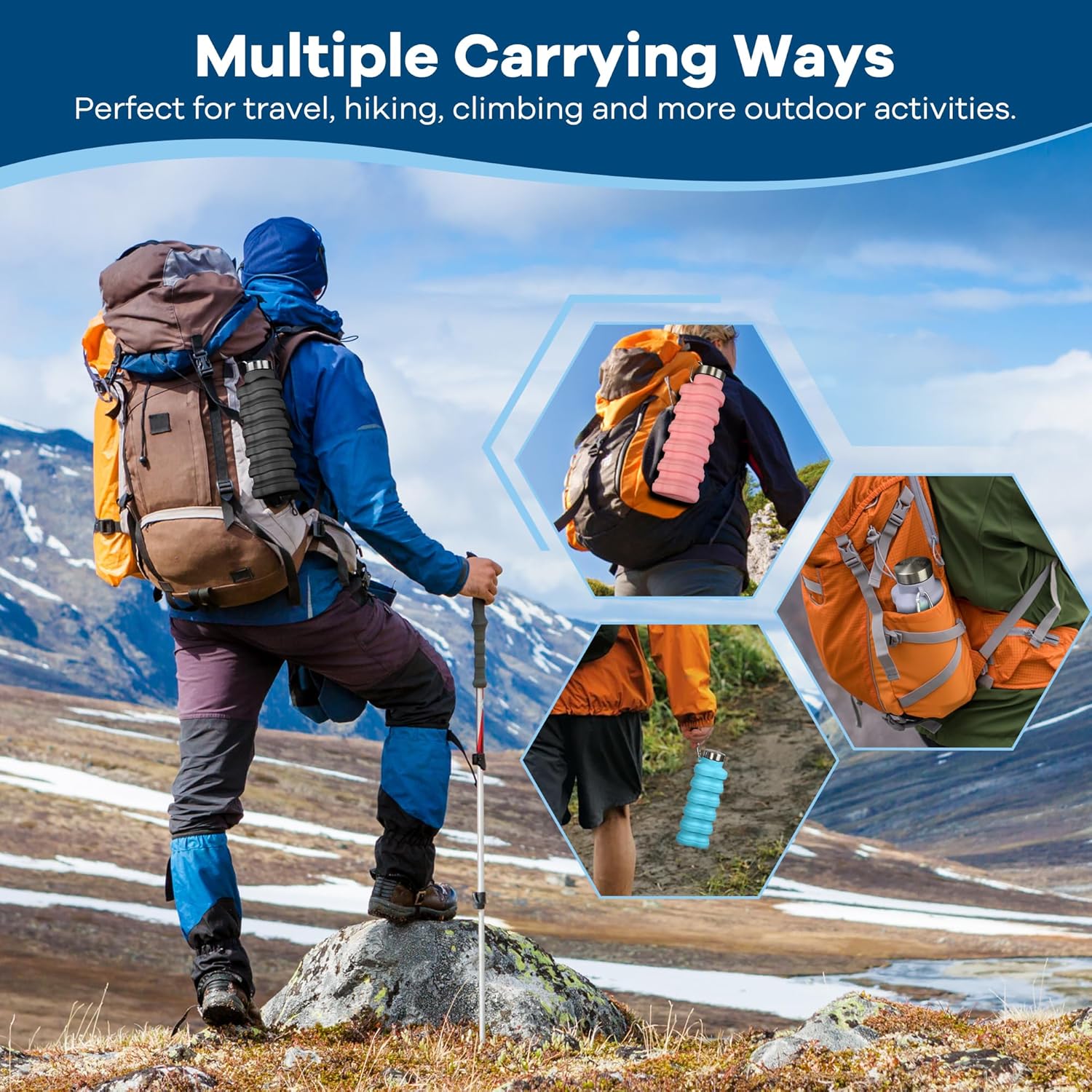 Ultra-Portable & Collapsible: Tired of bulky water bottles? Our 17oz collapsible bottle shrinks down to a mere 4.9 inches, fitting effortlessly into your pocket or bag. Weighing just 140g and equipped with a sturdy aluminium alloy carabiner, attach it to your backpack, gym bag, or belt loop—hydration on the go has never been easier!