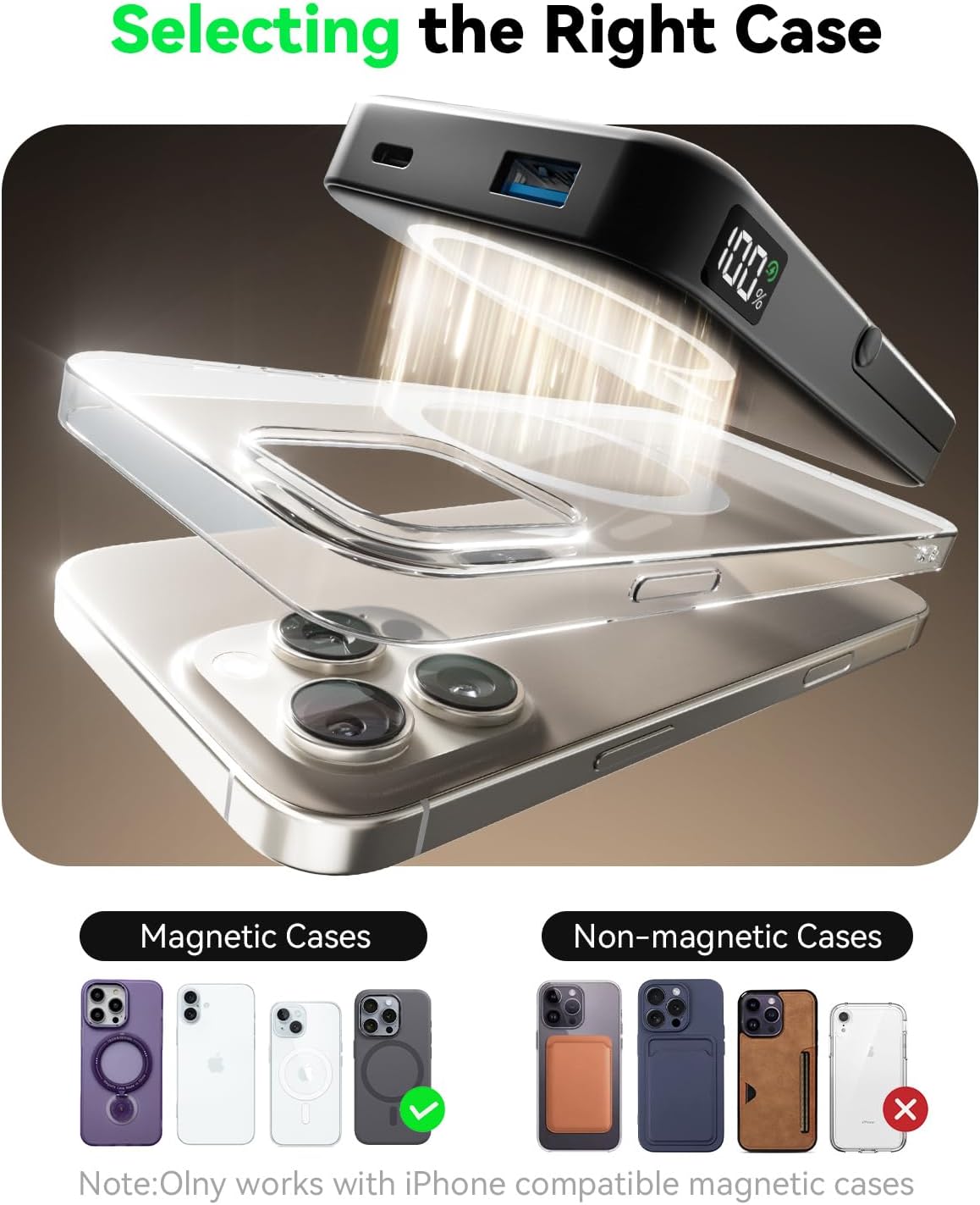 【Strong Magnetic Charging for MagSafe】Snap and go with powerful built-in N52 magnets that align perfectly with iPhone 16/15/14/13/12 series.Designed for MagSafe battery pack use,ensuring secure,stable wireless charging even when you’re on the move.No slipping,no repositioning—just effortless wireless power on the back of your iPhone.