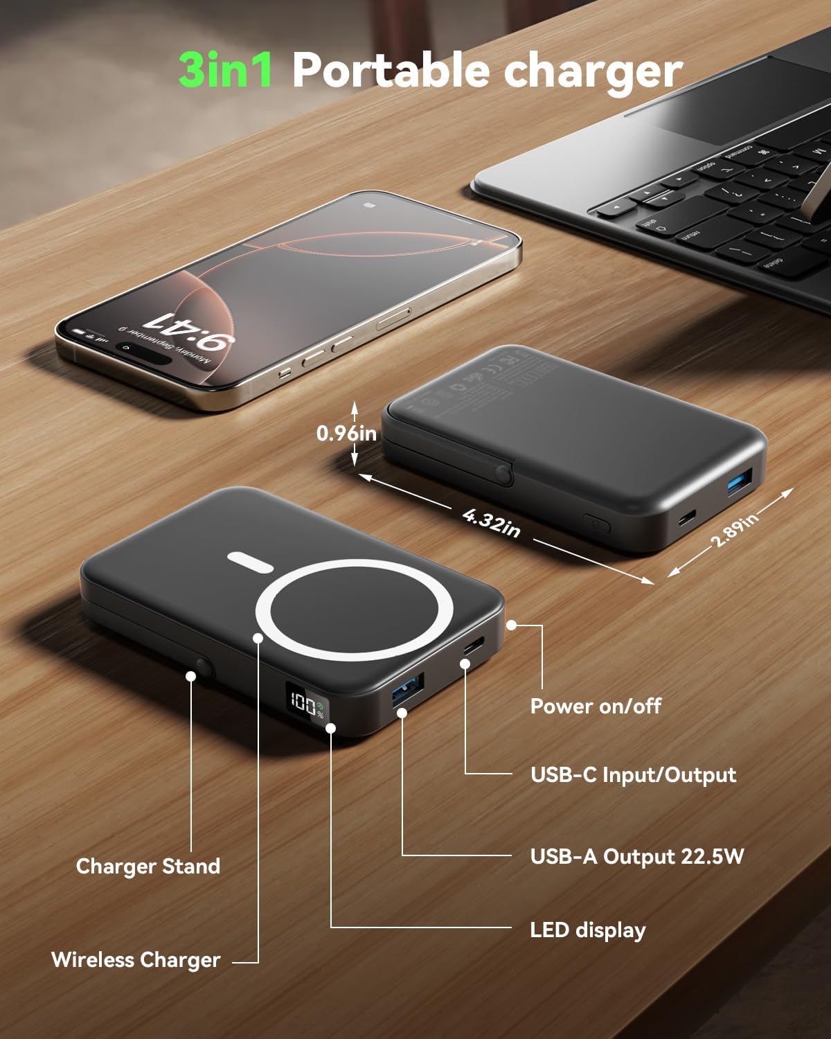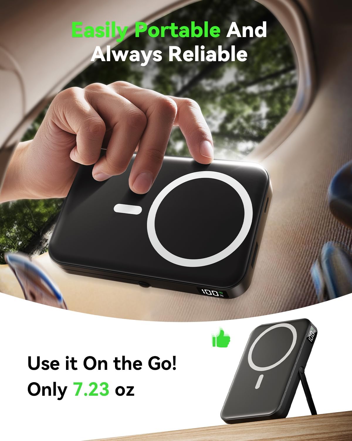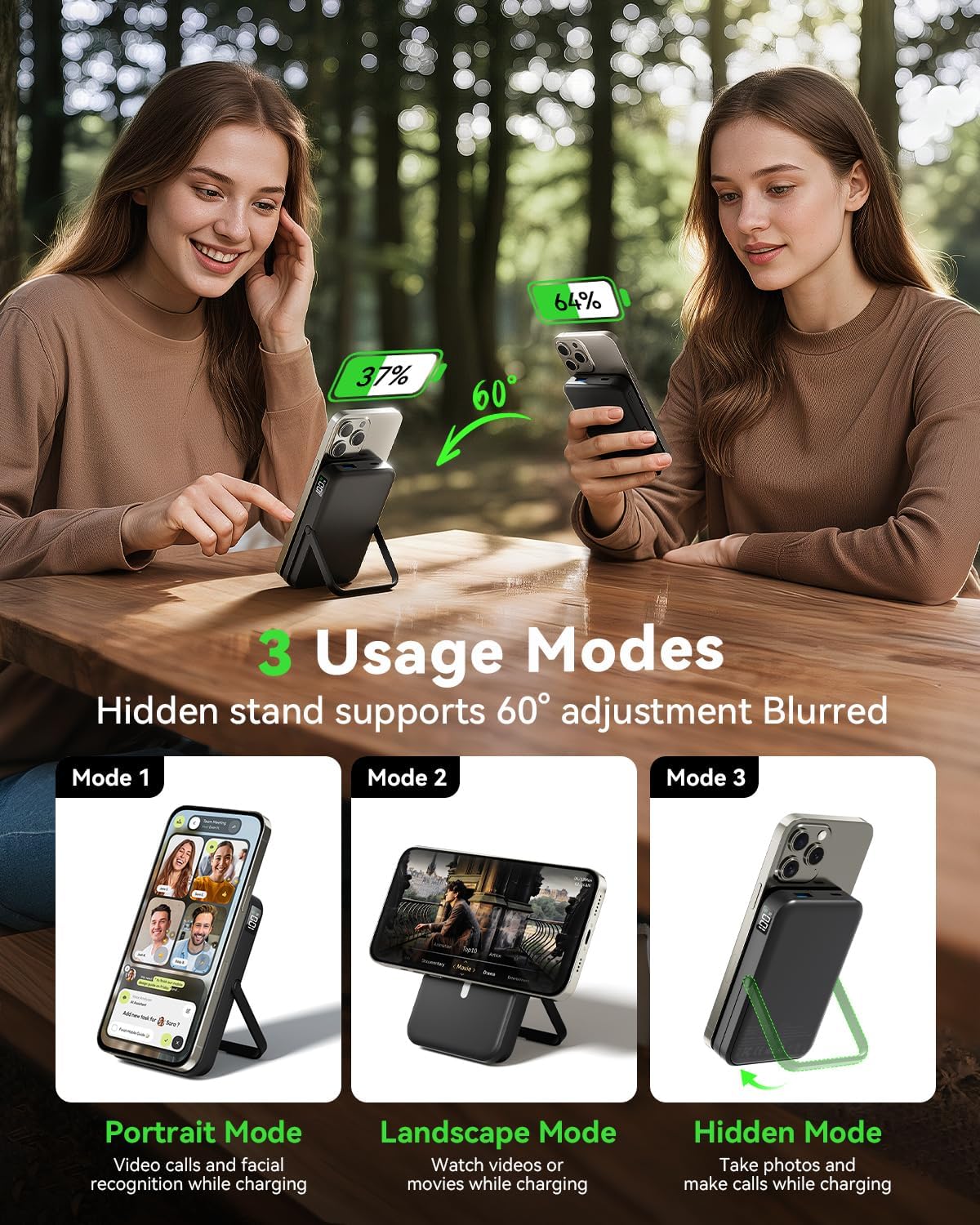 【Foldable Stand for Hands-Free Use】Equipped with a sturdy foldable stand,this wireless charger for MagSafe iPhone easily transforms your device into a mini workstation or entertainment screen while charging.Use it vertically for FaceTime or horizontally for Netflix.More than just a power bank,it’s a practical portable charger that adds convenience to work,travel,or daily use.