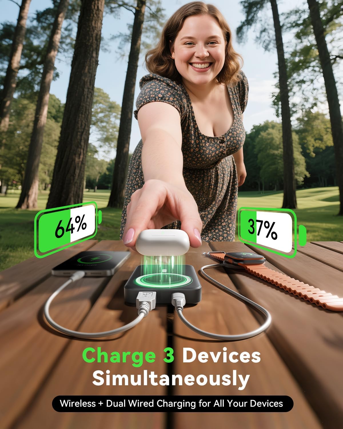 【22.5W Fast Charging with 10000mAh】Equipped with USB-C PD 20W fast charging output and USB-A 22.5W output,this wireless power bank can charge your iPhone up to 60% in just 30 minutes.The 10000mAh high-density lithium polymer battery offers up to 2 full charges for most iPhones—perfect for travel,daily use,or emergencies.