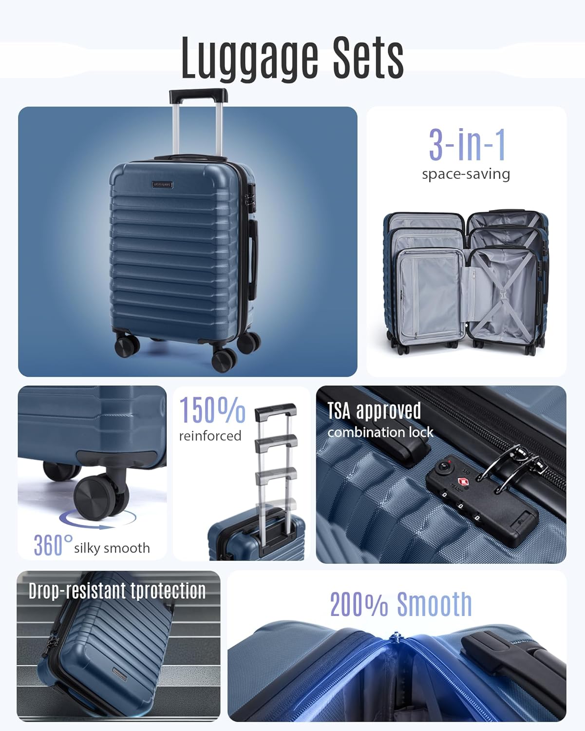 Smooth Mobility: Experience effortless travel with premium 360-degree spinner wheels. Made with soft TPU and lubricated ball bearings, suitcases with wheels glide smoothly and silently, allowing for easy maneuverability in any direction. Designed for stability, the dual-wheel system ensures a steady roll, making 3 piece luggage set ideal for long trips or business travel. Enjoy a seamless journey, whether navigating crowded airports or bustling city streets