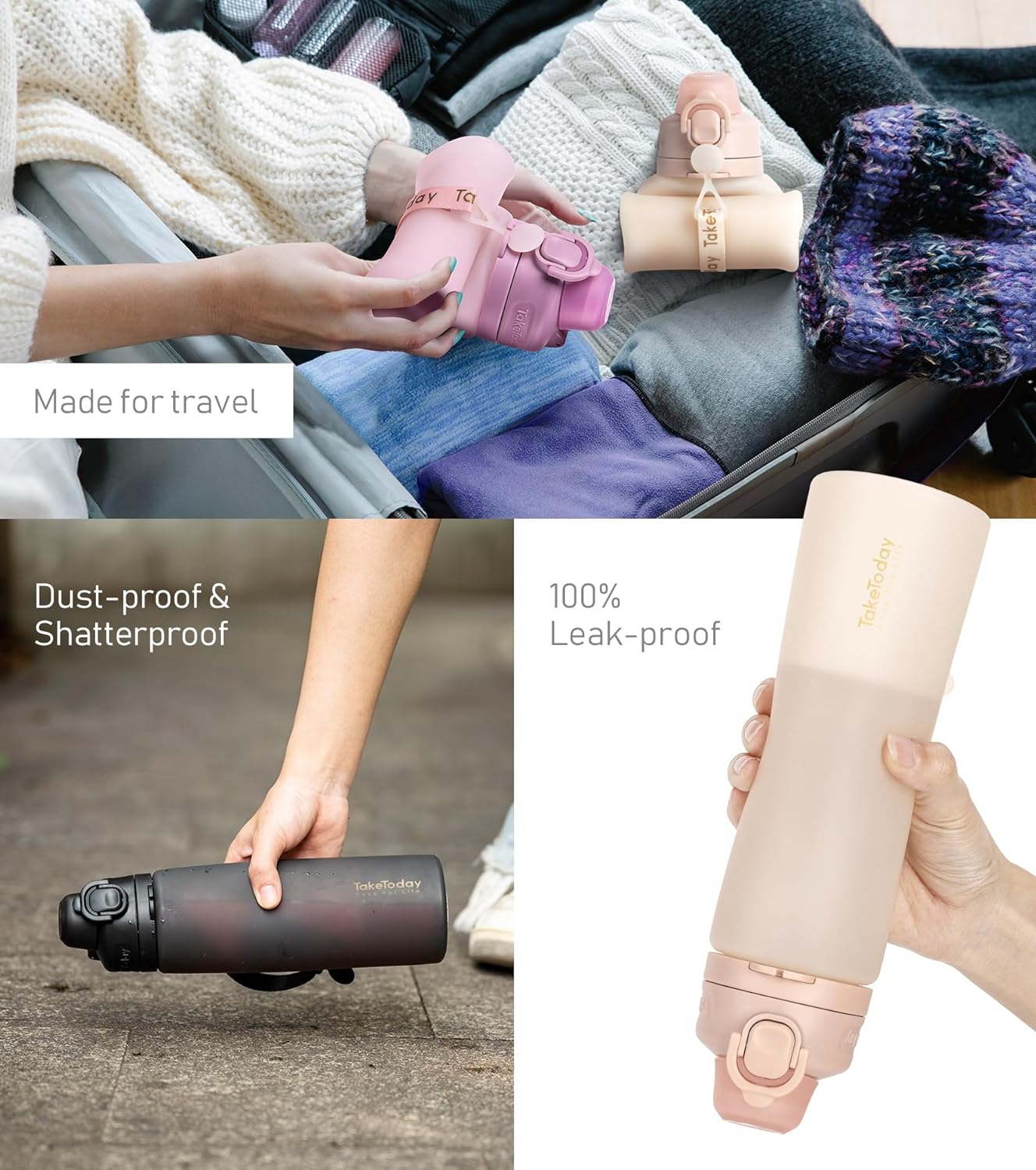 [Sturdy] The TakeToday collapsible water bottle is composed of high-quality food grade silicone. Unlike glass cups and plastic bottles, which are easily broken, the bottle body is soft and robust, able to withstand dropping, squashing, smashing, and hits, so you can enjoy using it without worry